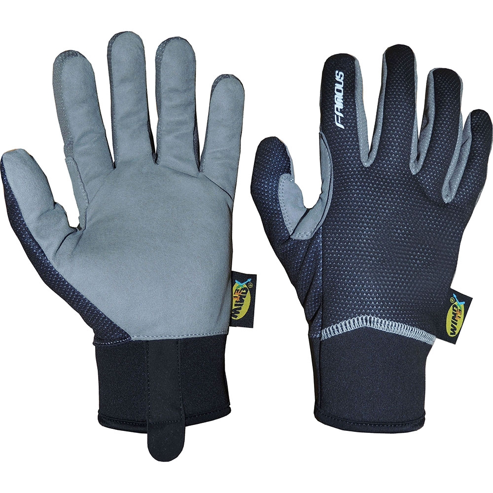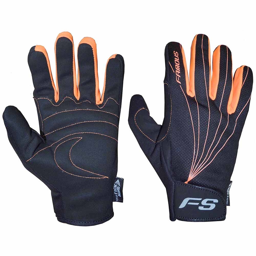 Made of imported Synthetic Leather AMARA Palm with Foam Padding, Back Nylon WindTex Fabric, contrast Designing on palm, Black color with Combination of Neon Orange Softshell between Fingers , Silicone Logo Printing on Back, Amara Velcro Strap on Cuff. Sizes. XXS to 2XL.